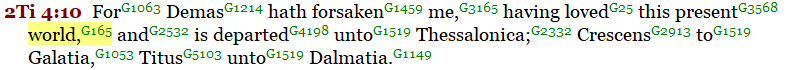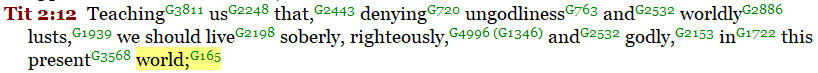 In Galatians 1:4, we read about the deliverance of Jesus from their present “world” or “evil age” in which they lived. Paul admonishes Timothy about the riches and allurements of “the present world” or “age” in which they lived. 1 Timothy 6:17, 2 Timothy 4:10, Titus 2:12