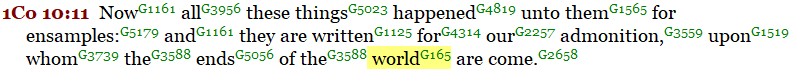 The Apostle Paul even went so far as to say that the end of the “world” (“aion”) or “age” had come upon them in the first century. 1 Corinthians 10:11