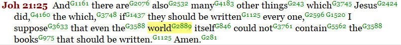Another example can be found in John 21:25. Here John boldly proclaims that the “kosmos” or “world” or “Universe” itself could not contain the books that could be written about all the acts of Jesus because He is God manifest in the flesh.