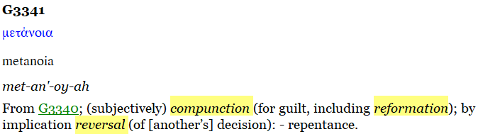 Repentance comes from the Greek word “metanoia” Strong's G#3341. “Metanoia” means a reversal of a direction in life through words and actions, to think differently, or to reconsider the input of information; to repent, to change one’s mind.