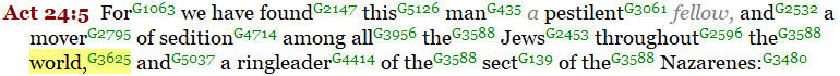 In Acts 24:5, we read about accusations against Paul. They accused him of being a mover of sedition among all the Jews throughout the “world” (oikoumene)
