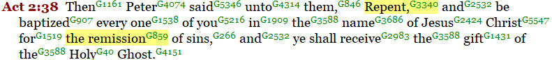 Second, we must realize that a person cannot receive forgiveness or remission of sins, “aphesis”, without first experiencing repentance “metanoeo”. True repentance must always come first before one can receive forgiveness. Mark 16:16, Acts 2:38