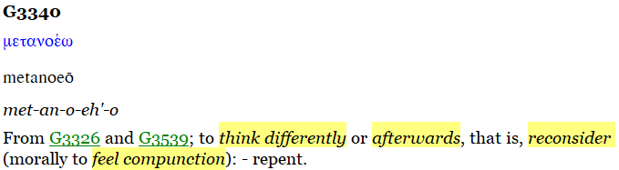 Some of the other more prominent New Testament Scriptures where the Greek word “metanoeo” is used are: Luke 3:8, 13:3,5 16:30 17:3,4 24:47, Acts 2:38-39, 5:31, 8:22, Romans 2:4, 2 Timothy 2:25, Hebrews 6:1,6 2 Peter 3:9, Revelation 2:22