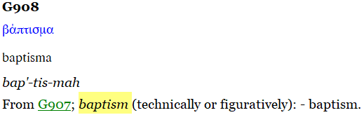 The word baptism comes from the Greek word baptisma: (bap’-tis-mah) meaning