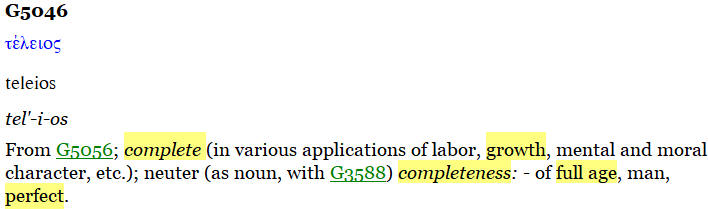 Also, according to Strong’s, the word “perfect” in the Greek meant completeness, full age, to fit, mend, restore, to accomplish, to finish, to complete, consummate, to finish.