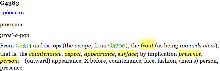 Also, in 1 Corinthians 13:12, “face” Strong's G#4383 here also means “presence”. 2 Peter 1:16, the word “coming” is the Greek word “Parousia” Strong's G#3952 which means the presence of He who comes.
