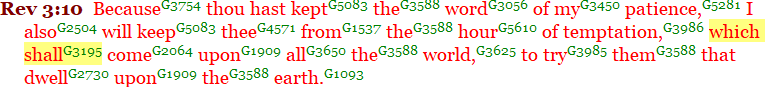 Jesus states again in Revelation 3:10 the imminency of the coming tribulation. Here Jesus says “…. I will also keep thee from the hour of temptation which shall (“mello”) come upon all the world…” (their world)