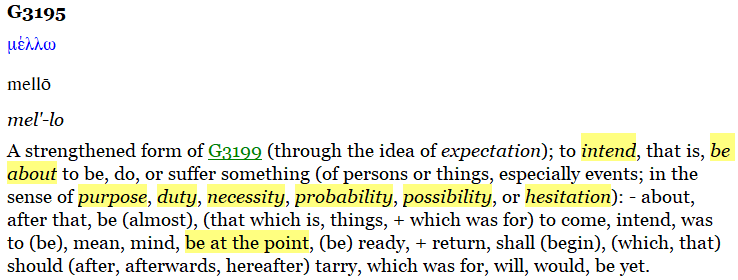 The Scriptures involving this word, “mello” and the coming of Jesus Christ imply the imminency of His coming and therefore further substantiate a first century return.