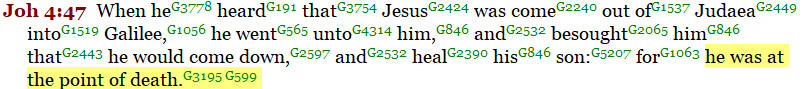 John 4:47, we read about a certain nobleman whose son was at the point (“mello”) of death.