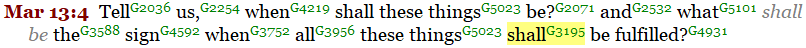 Our first two references are seen at the beginning of the Olivet Discourse in Mark. 13:4 and in Luke 21:7.