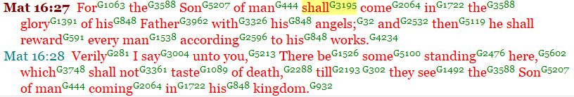 Jesus makes a strong time statement in Matthew 16:27-28. “For the Son of man shall (“mello”) come in the glory of his Father…. he shall reward every man according to his works….”