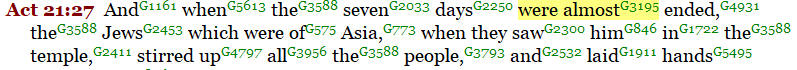 Acts 21:27 speaks of the seven days of purification were almost (“mello”) ended when Jews stirred up all the people against Paul.