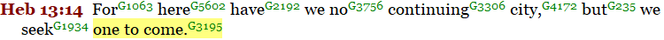 Their “continuing city”, their New Jerusalem was about to come. (“mello”) It was very near. In Revelation 1:19, we see the glorified Jesus telling John to write the things which he was seeing and to write the things “which shall (‘mello’) be hereafter”.