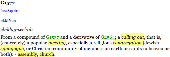 The Original Greek word for 'Church' is ecclesia and means: a calling out, meeting, congregation, synagogue, assembly.