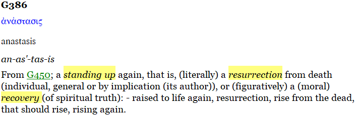 The Greek word for “resurrection” is “anastasis” and is defined as “a raising up” or “rising up” and in some passages of Scriptures is defined as “resurrection from the dead”.