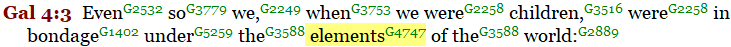 We can plainly see from the context of these two verses, that the Jews were once held in bondage to the “elements” (“stoicheion”) of their world, of their Old Covenant world in which they observed “days, weeks, months, and years of the Law of the Old Covenant”.