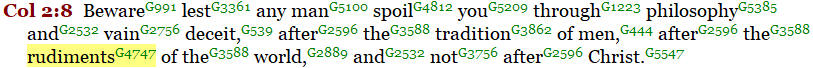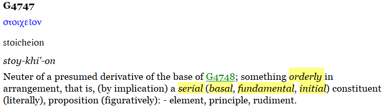 “Stoicheion” appears seven times in the New Testament. In Galatians 4:3,9, we can clearly see the context of this Greek word, “stoicheion” or “elements”.