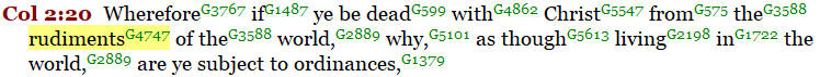 The understanding of these basic rudiments of the Law is what led them to their acceptance of the Gospel message brought to them by Christ. Once again, this Greek word “stoicheion” refers to the “elements” of teaching in the Old Covenant Law NOT the atoms, Earth, wind, fire, or water.