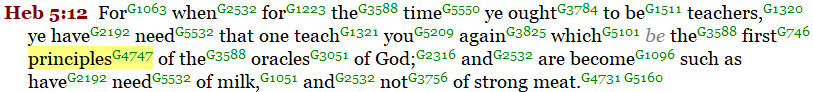 In Hebrews 5:12, the writer is admonishing the Hebrew believers for their lack of growth in understanding the fundamental principles (“stoicheion”) of the oracles of God.
