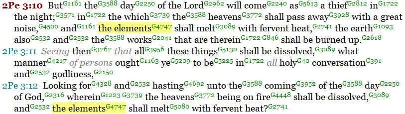 Here we read the statement “…the elements (“stoicheion”) shall melt with fervent heat.” Just as we read in all of the other previous usages of the Greek word “stoicheion”, this usage is consistent in its meaning: