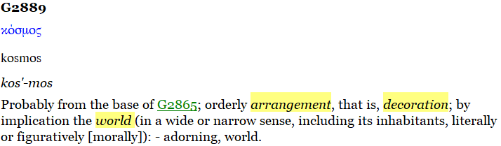 "Kosmos" is often used to refer to the Jews in a broader sense, that is to their present order or arrangement of Old Covenant Judaism. This Greek word "kosmos" is used by Jesus as He prays in the garden prior to His crucifixion in John 17:6. "I have manifested thy name unto the men which thou gavest me out of the world ("kosmos"): thine they were, and thou gavest them me and they have kept thy word."