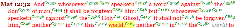 Matthew 12:32, Matthew 13:39-40,49 (the harvest referred to here is the end of the world ("aion"), Matthew 24:3, Matthew 28:20, Mark 10:30, Acts 3:21, Romans 12:2, Ephesians 1:21, Hebrews 9:26.