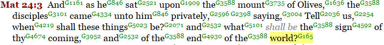 Above is Matthew 24:3 in the King James Version, Apocryphal New Testament, Young's Literal Translation and the Scriptures.