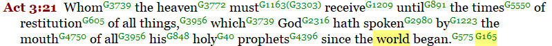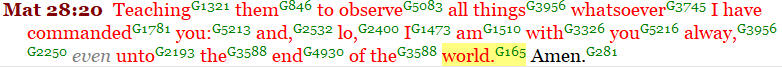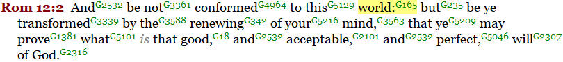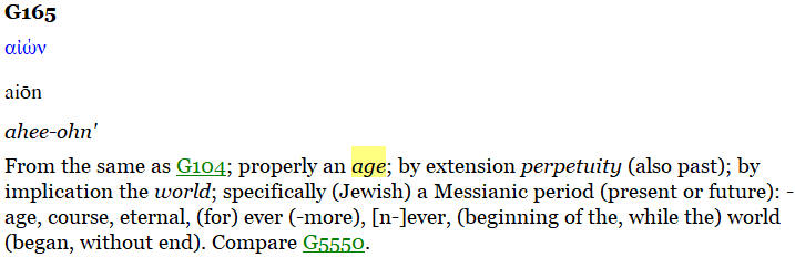 The word "Aion" has its use in Scripture as age noting the end of the Old Covenant, not the end of time. Many people when they read the Scriptures mistake the word world, ("aion") to mean the end of this physical planet when it really means the end of the age. The end of their age was coming very soon, that is the end of the Old Covenant. The following Scriptures use the Greek word "aion" which means age: