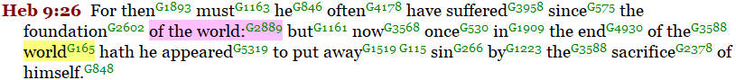 If you notice above in Hebrews 9:26 there are two English words 'WORLD', However they have two different Greek words used. I have highlighted one in yellow and one in purple.