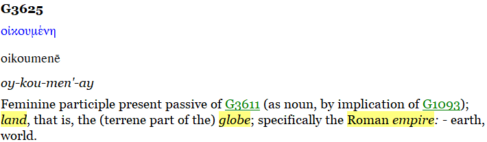 3. Oikoumene - Land, the world, (in Scripture, generally referring to the Roman Empire), the inhabited earth.