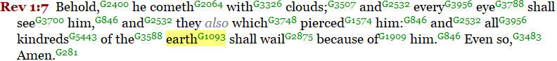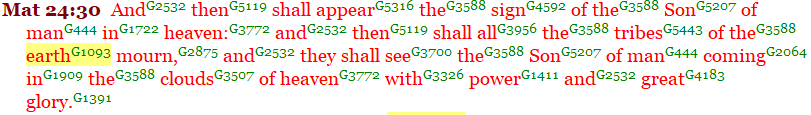 In Matthew 24:30, it says, "And then shall appear the sign of the son of man in heaven and then shall all the tribes of the earth ("ge") mourn, and they shall see the son of man coming in the clouds of heaven with power and great glory."