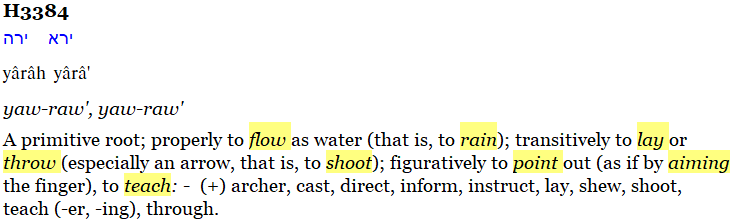 Consequently, turah, one of the nouns derived from this root, is, therefore, the arrow aimed at the mark, the target is the truth about Yahuah (the LORD) and how one relates to Him.