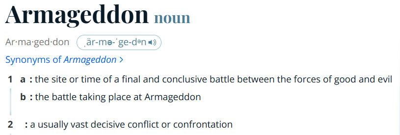 Webster’s Dictionary defines "Armageddon" as "the place where the last decisive battle between the forces of good and evil is to be fought before Judgment Day."