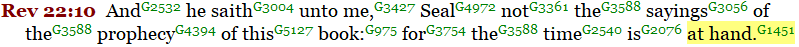 The Apostle John was saying that all of the events that he had recorded in the Book of Revelation were soon to come to pass (“eggus”) In Revelation 22:10, John was instructed to NOT seal the sayings of the prophecy of this book: for the time is at hand (“eggus”) This is in direct contrast to the prophet Daniel who received visions of “end-time events” Daniel was told to seal the book until the time of the end. (Daniel 12:4,9) Daniel received these visions 6th century BC some 750 years prior to the fulfillment of his vision of these “end-time” events.