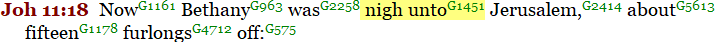 John 11:18 says “Now Bethany was nigh (‘eggus’) unto Jerusalem, about 15 furlongs off:”