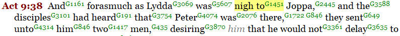 One more example of “eggus” used in this way is Acts 9:38; “…Lydda was near (‘eggus’) Joppa….”