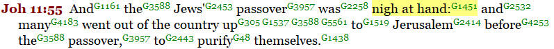 In John 11:55, we read about the Jews’ Passover; it was nigh at hand (“eggus”). When “at hand” was added to “nigh”, this stressed the nearness of an event even more.