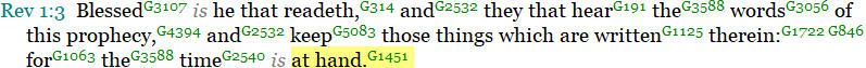 In Revelation 1:3, we read: “….for the time is at hand (‘eggus’).”