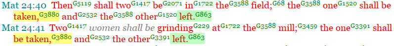 As you can see, the word "taken" refers to being received near, and the word "left" refers to being forsaken.
