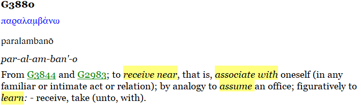 The word "taken" comes from the Greek word "paralambano" Strongs G#3880 which means "to receive near".